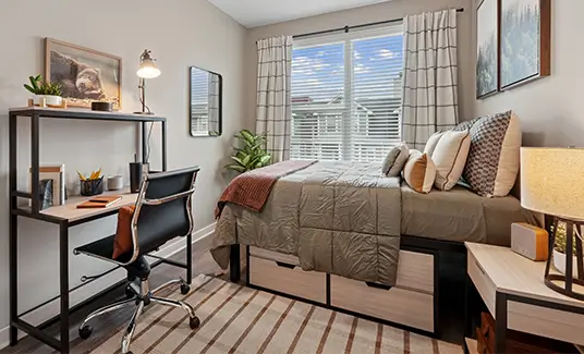 We offer fully furnished FSU apartments in various floor plan options, including studios, one-bedroom, two-bedroom, three-bedroom, four-bedroom, five-bedroom, and six-bedroom apartments. Our apartments come outfitted with stylish furniture, stainless steel appliances, quartz countertops, hardwood-style floors, private bedrooms with en-suite bathrooms, and an in-unit washer and dryer.